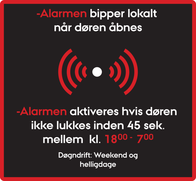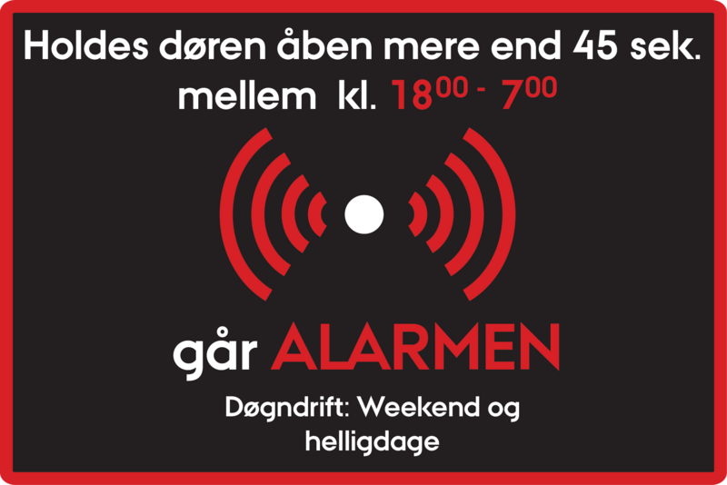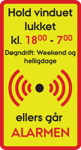 Det er forbundet med udgifter hver gang der går en alarm, og for at forhindre utilsigtede alarmer i de nævnte tidsrum er de nedenfor illustrerede advarselslabels sat på døre og vinduer rundt omkring i bygningerne.